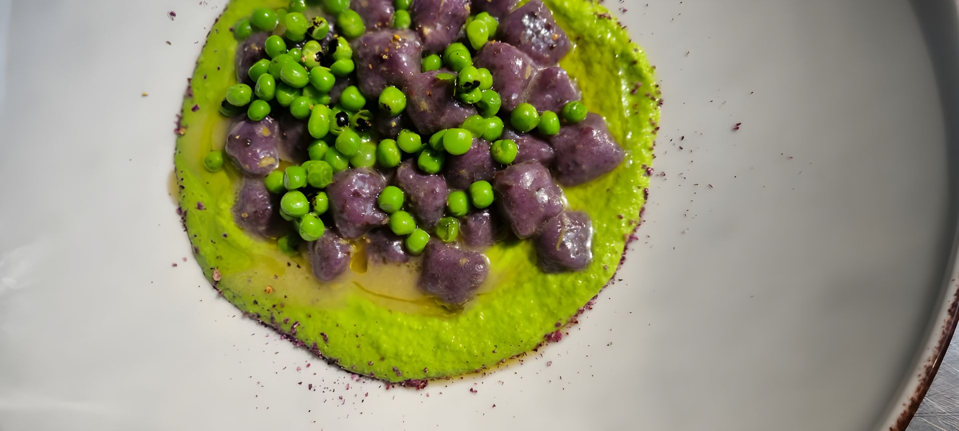 (artisanal purple potato gnocchi on spring pea velouté, parmigiano and charred sautée peas)